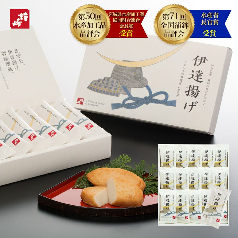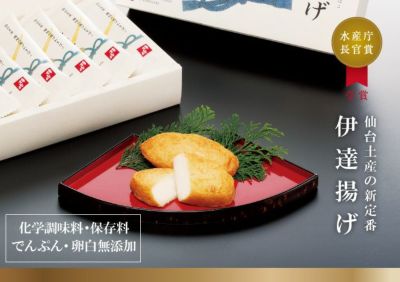 ◆伊達揚げ・・・15枚 吟味したすり身に、隠し味として仙台藩ゆかりの「ごえんそ味噌」を加えた揚げかまぼこです。「ごえんそ」という名称は、仙台藩初代藩主 伊達政宗公がかつて仙台城の城内に設けていた味噌工場「御塩噌蔵」に由来します。このまちに受け継がれてきた伝統的な味噌の風味をお楽しみください。 |