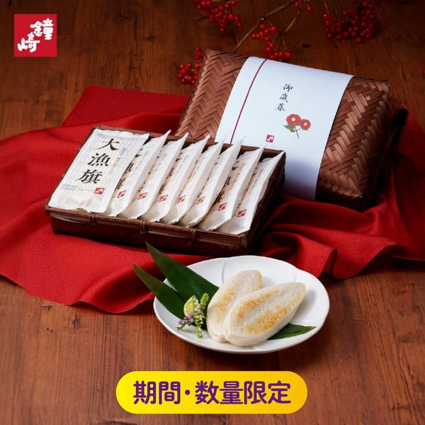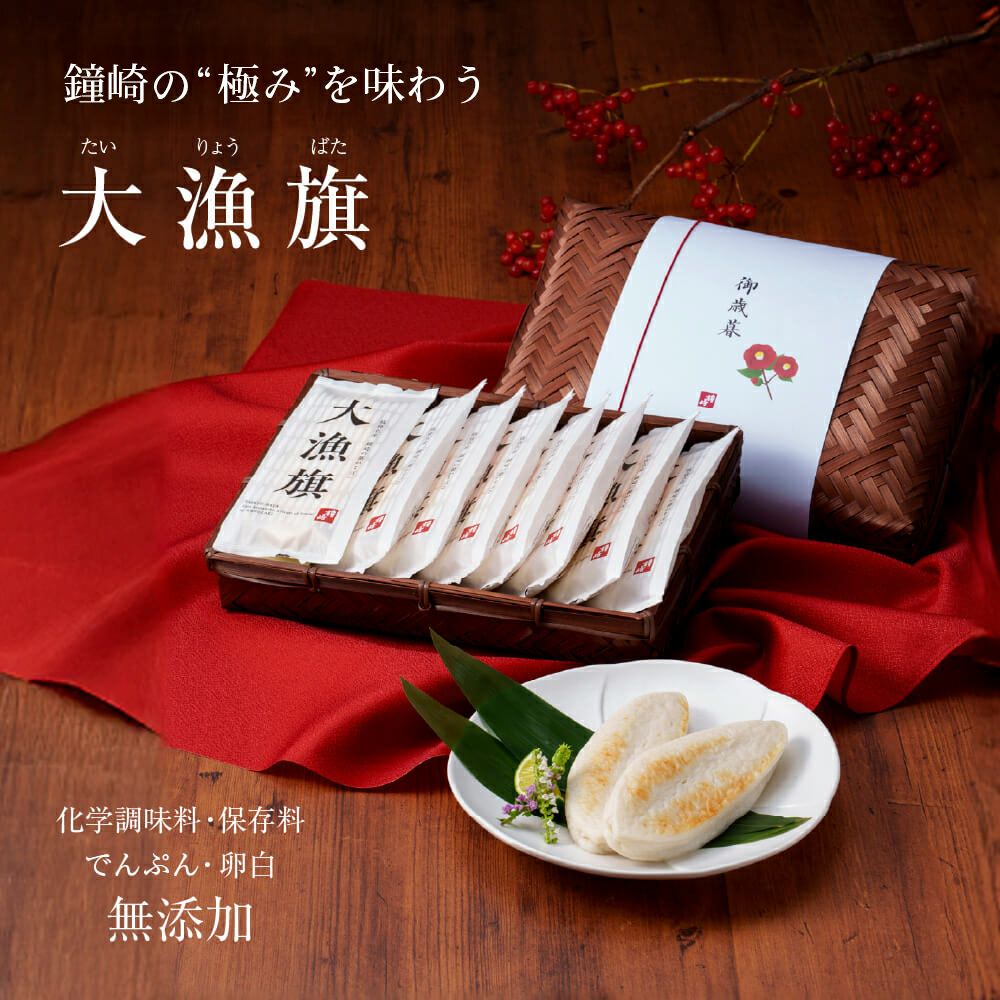 ◆大漁旗・・・8枚 圧倒的な大きさと厚み、ふっくら柔らかな食感、ふわっと広がる魚のうまみ。ひとくちで違いを実感していただける、プレミアムな笹かまぼこです。高級魚「吉次」や「伊達の旨塩」など、厳選素材を使用して丁寧に焼き上げました。 |