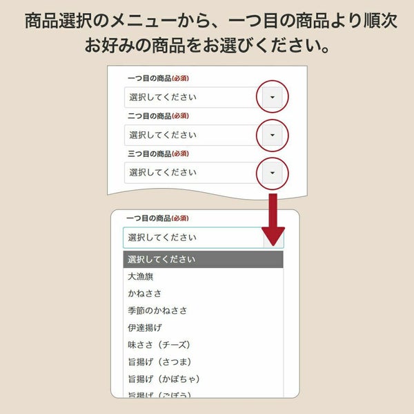 魚のうまみを味わう〈さつま〉と、野菜たっぷりの〈ごぼう〉〈かぼちゃ〉、3つの味をご用意しました。