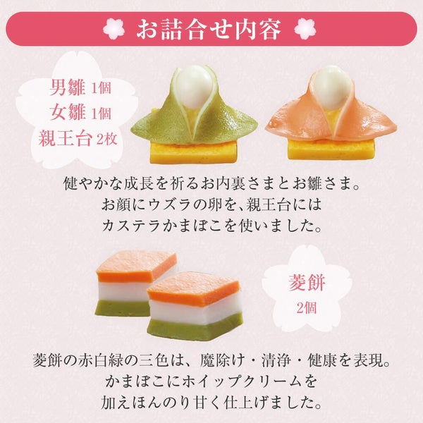 男雛1個、女雛1個、親王台2枚、末広1個、はまぐり2個、桃花1個、菱餅2個、ぼんぼり2個