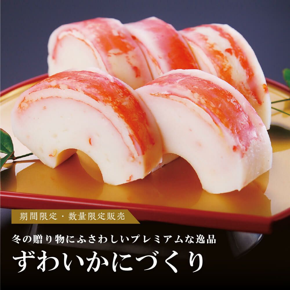 ◆ずわいかにづくり・・・1本 冬の味覚の王様「本ずわいがに」の身を贅沢に使用し、末広がりの扇形に蒸し上げました。お正月の食卓に華やかな彩りを添える贈り物です。 |