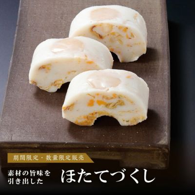 ◆ほたてづくし・・・1本 末広がりの形状と「帆を立てる」という名前の由来から、長寿や幸運をもたらす縁起物とされてきた「ほたて」。職人の丁寧な手作業により、北海道産のほたてのおいしさをかまぼこに閉じ込めました。なめらかなすり身の中に、ほたて本来の食感をお楽しみいただけます。 |