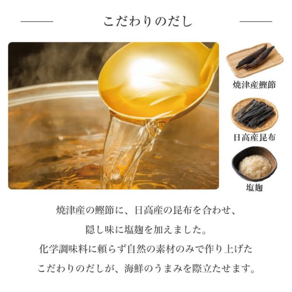 焼津産の鰹節に、日高産の昆布を合わせ、隠し味に塩麹を加えました。化学調味料に頼らず自然の素材のみで作り上げたこだわりのだしが、海鮮のうまみを際立たせます。