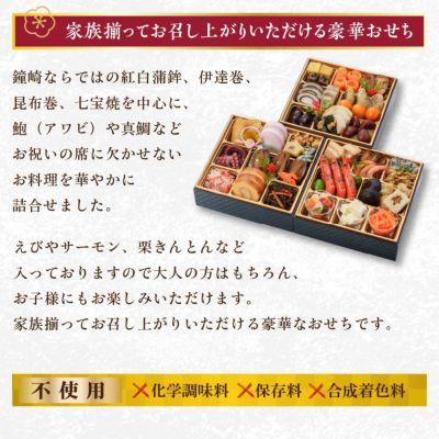 数の子、蒲鉾(紅・白)、くるみ甘露煮、田作り煮、丸十絵馬、真だこ酢漬、鮑煮、鶴人参、なます、伊達巻、松前漬