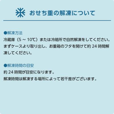 冷蔵庫(5~10℃)または冷暗所で自然解凍をしてください。まず、ダンボールより取り出し、お重のふたを開けて解凍してください。