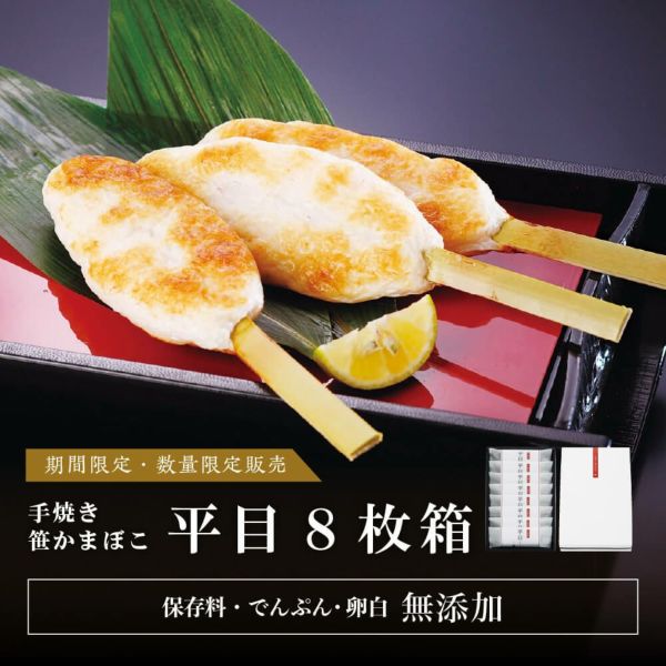 ◆手焼き笹かまぼこ 平目・・・8枚 天然の平目の身は、昔ながらの石臼で、程よい弾力となめらかさをあわせもつすり身になります。丁寧に形を整え、じっくり焼き上げれば、ふんわり柔らかな食感に。平目特有の上品な味わいを、存分にお楽しみいただけます。 |
