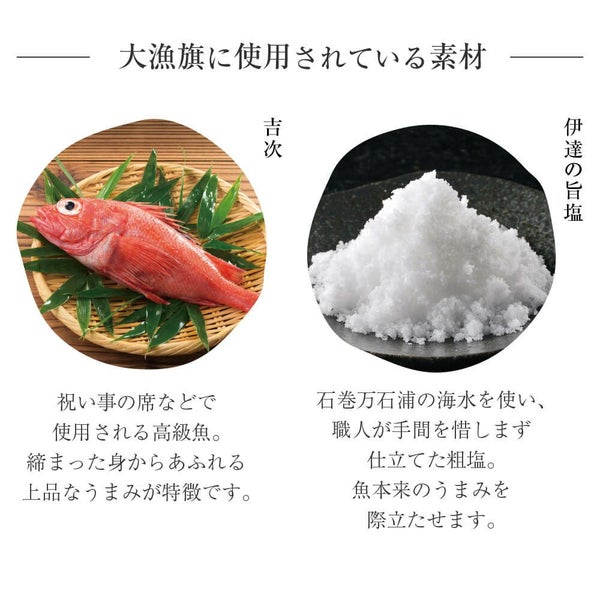 ◆大漁旗・・・4枚 圧倒的な大きさと厚み、ふっくら柔らかな食感、ふわっと広がる魚のうまみ。ひとくちで違いを実感していただける、プレミアムな笹かまぼこです。高級魚「吉次」や「伊達の旨塩」など、厳選素材を使用して丁寧に焼き上げました。 |