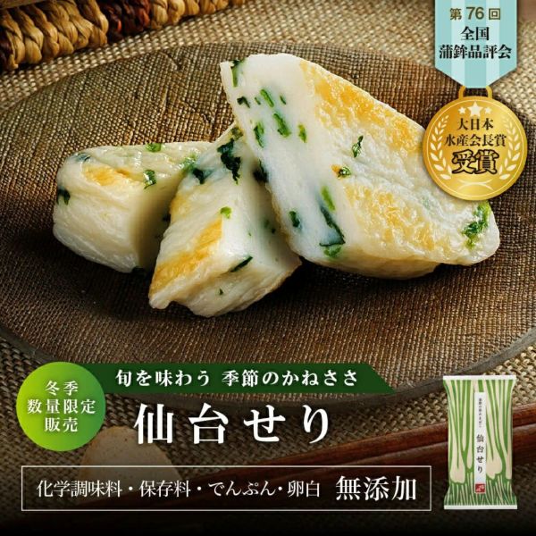 ◆季節のかねささ「仙台せり」・・・2枚 『季節のかねささ 仙台せり』は、鐘崎自慢の魚のすり身に、瑞々しい彩りと食感が魅力の宮城県産「仙台せり」を合わせました。かねささのうまみと、せりならではの清爽な香りをご堪能いただける一枚です。 |